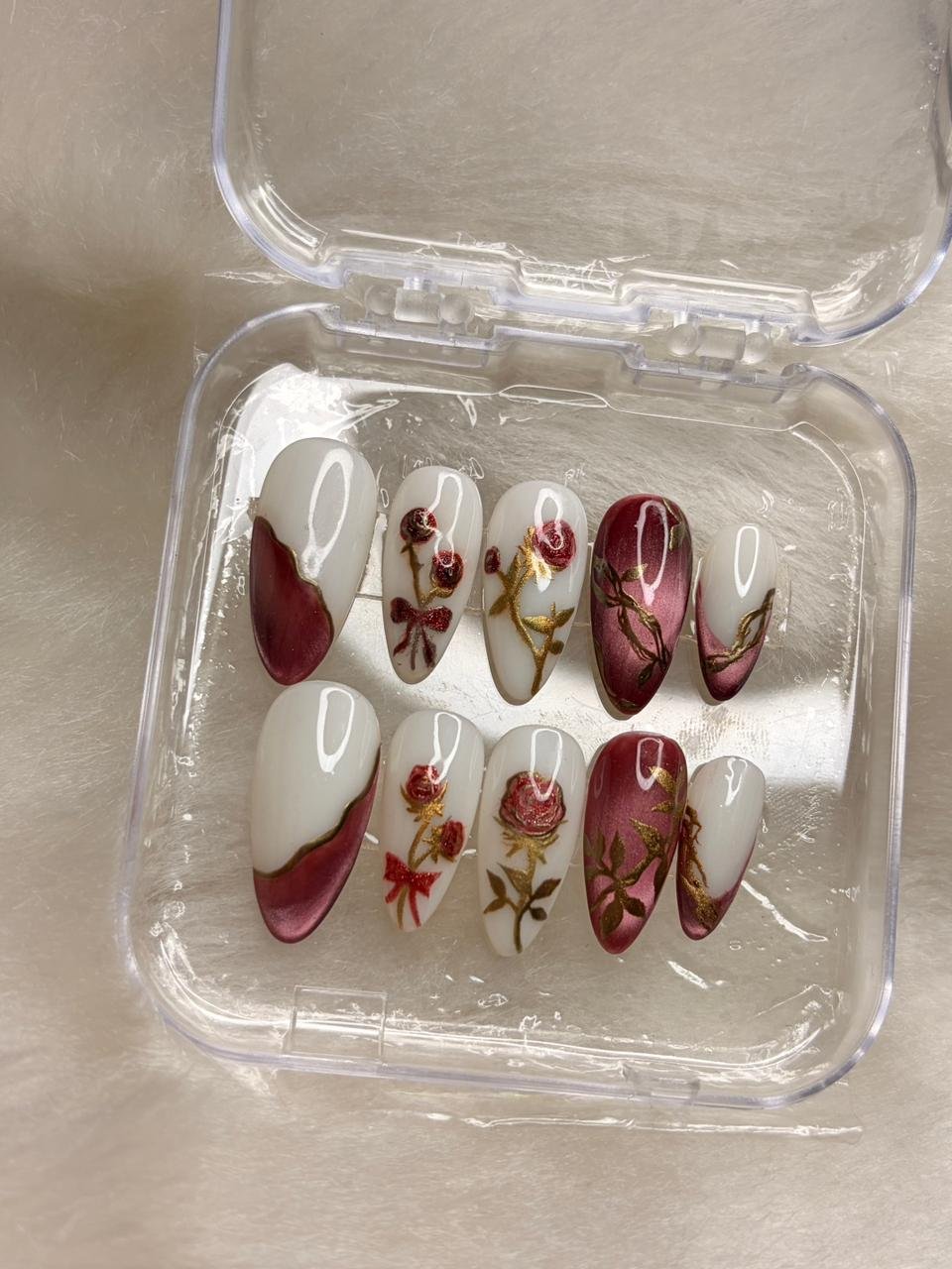 Soft ivory and deep wine tones come together with delicate hand-painted floral detailing, creating a look that feels warm and refined. Graceful and timeless like pressed petals in a love letter.